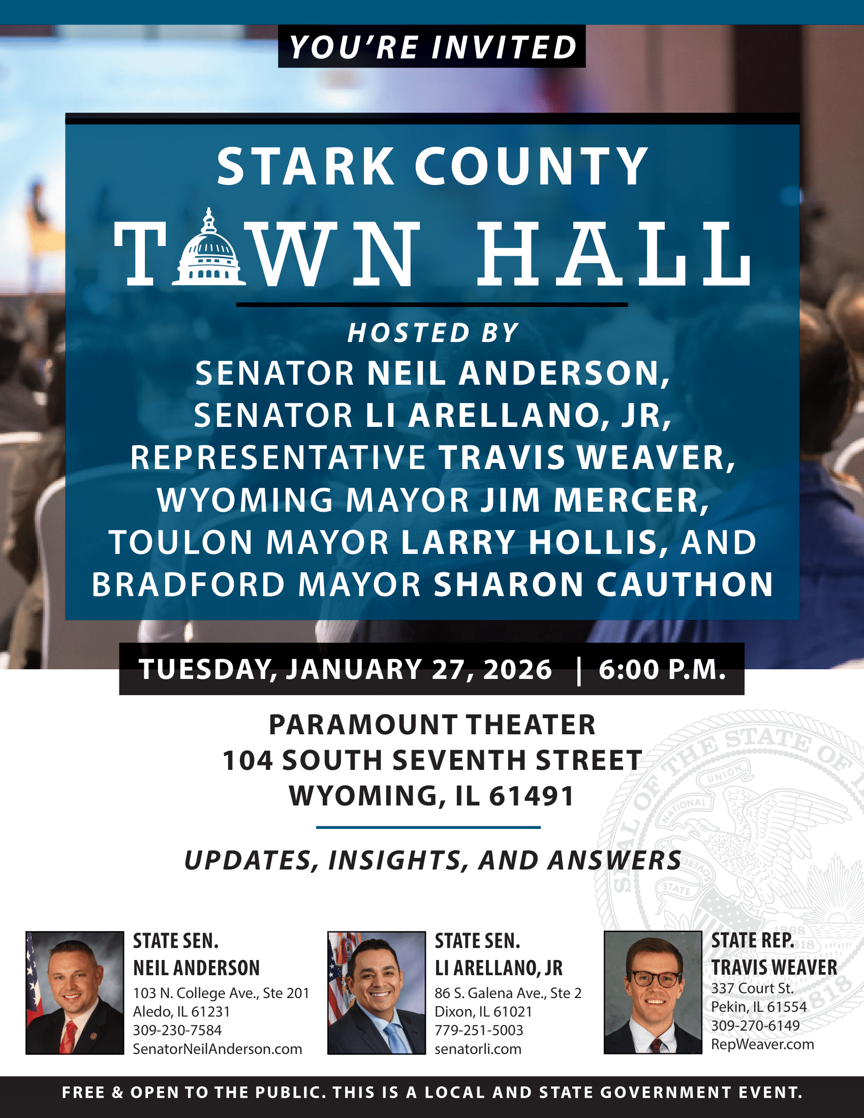 SPRINGFIELD, IL – State Senators Neil Anderson (R-Andalusia) and Li Arellano, Jr (R-Dixon), along with State Representative Travis Weaver (R-Peoria) and Stark County leaders, will host a countywide Stark County…